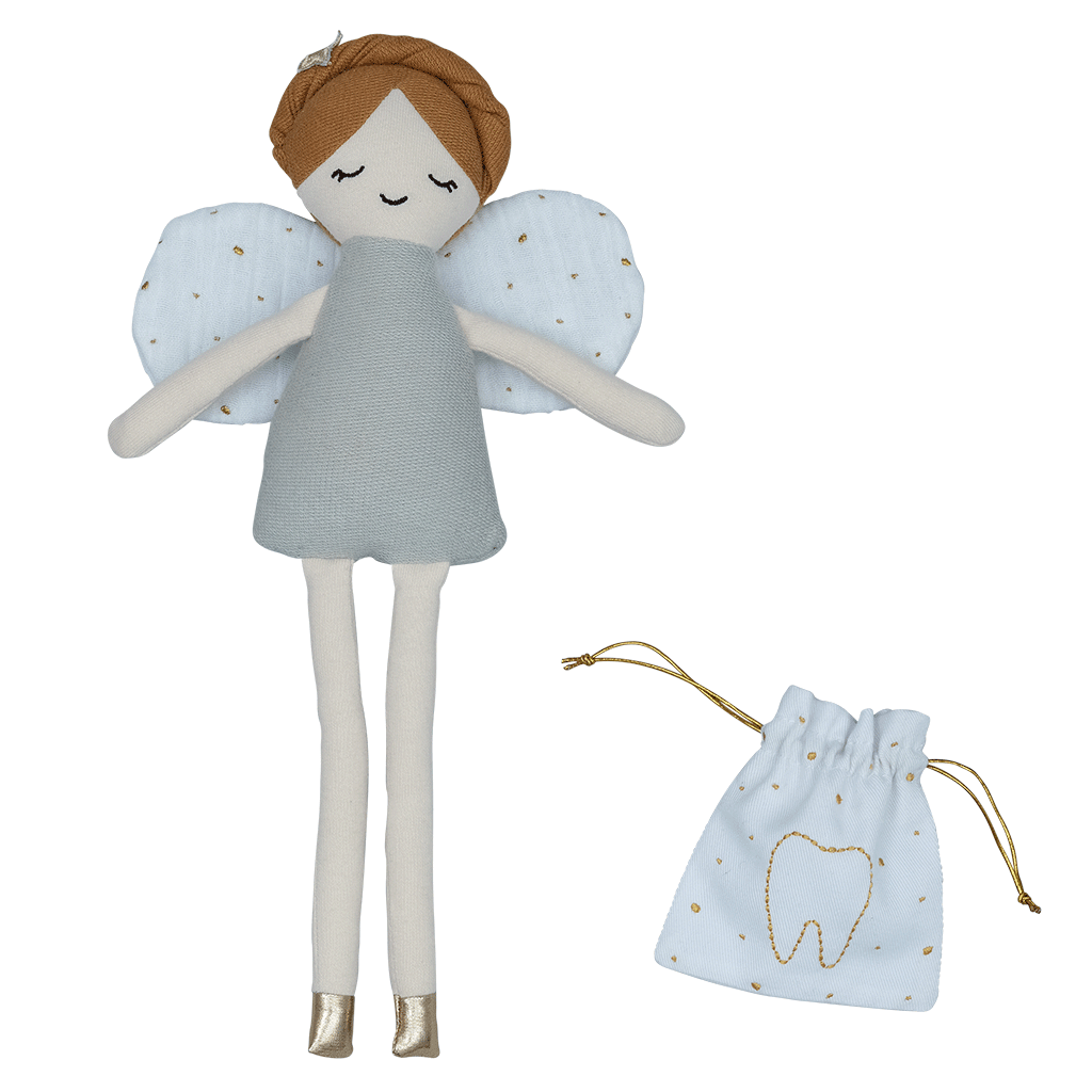 Puiki ekologiškos medvilnės lėlė, lydinti mažylius, kai jiems iškrenta pirmieji dantukai. Pridedamas maišelis dantukams laikyti.