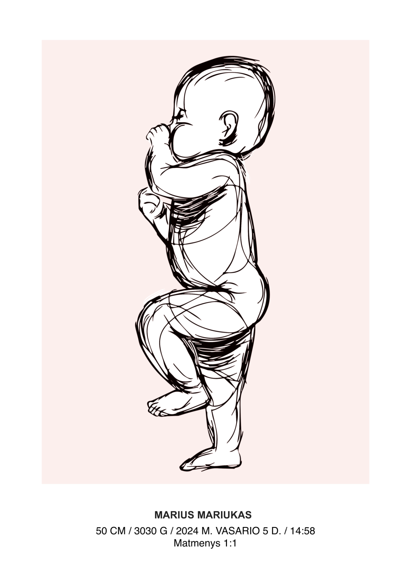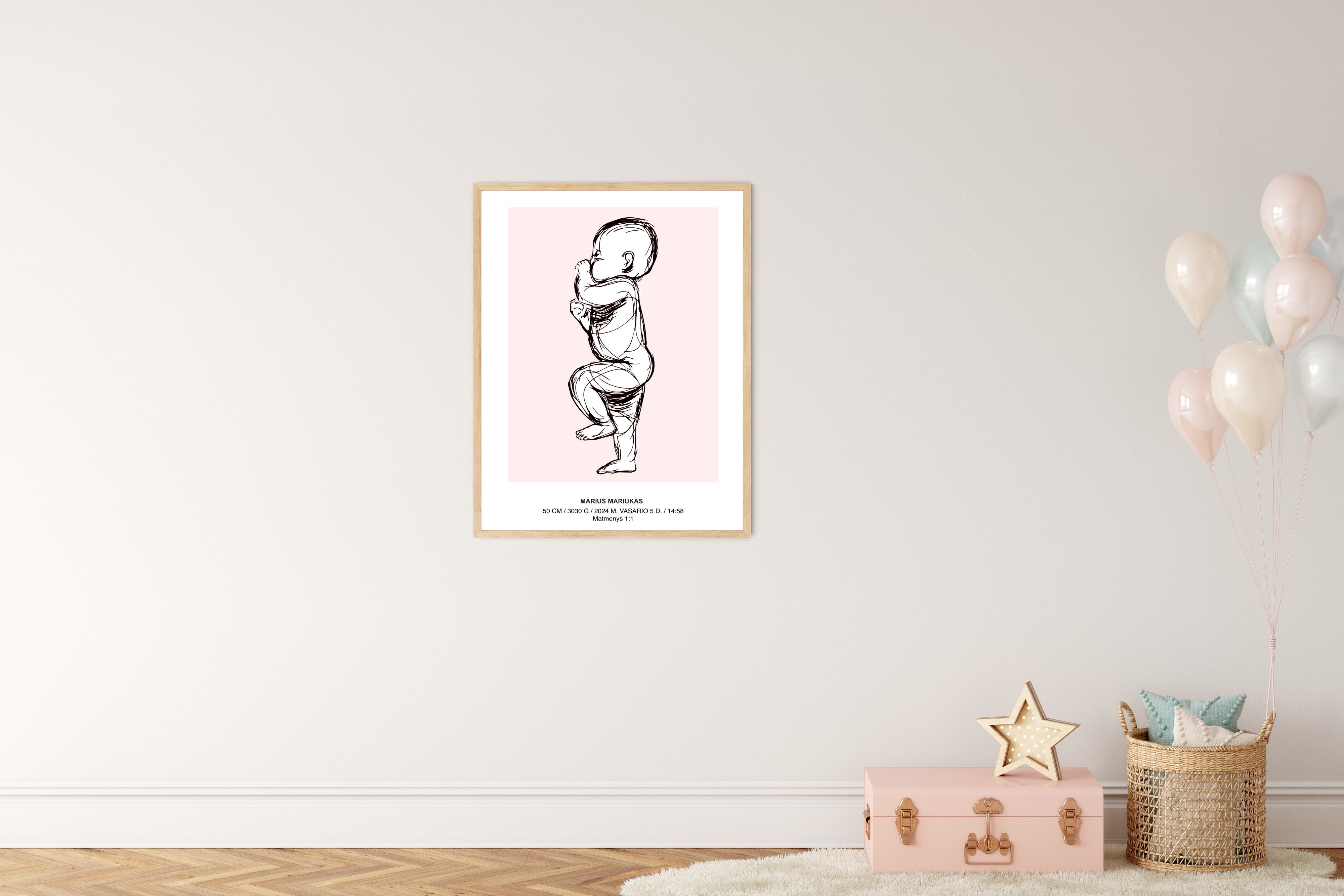 Stilingo dizaino kūdikio metrikų portretas masteliu 1:1 atvaizduoja Jūsų mažylį tokio paties ūgio kaip ir gimimo metu.