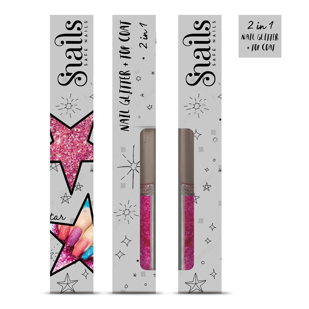 Dvipusis aplikatorius su nagų blizgučiu viename gale ir nulupamu bespalviu laku „Top Coat“ kitame.